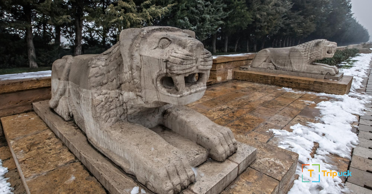 Aslanlı Yol, 600 metre uzunluğunda ve 12 aslan heykeli ile süslenmiştir. Mozole, Atatürk'ün mermer sarkofagunu barındırır.